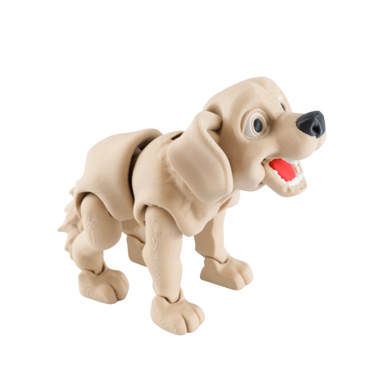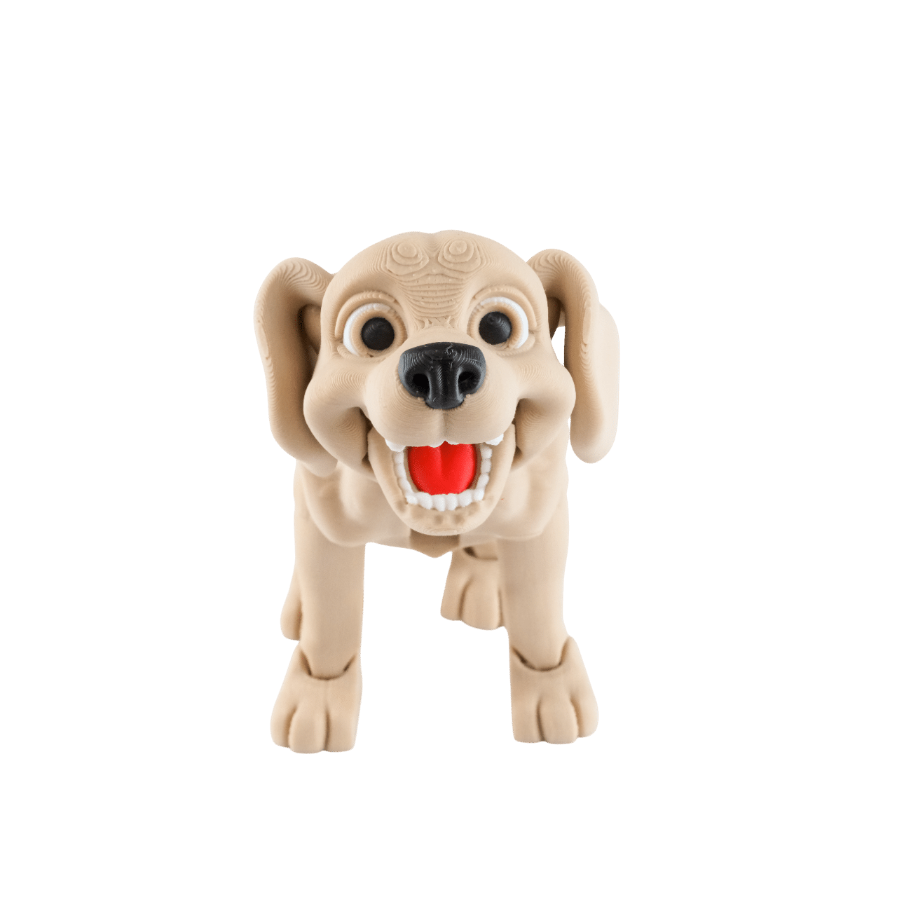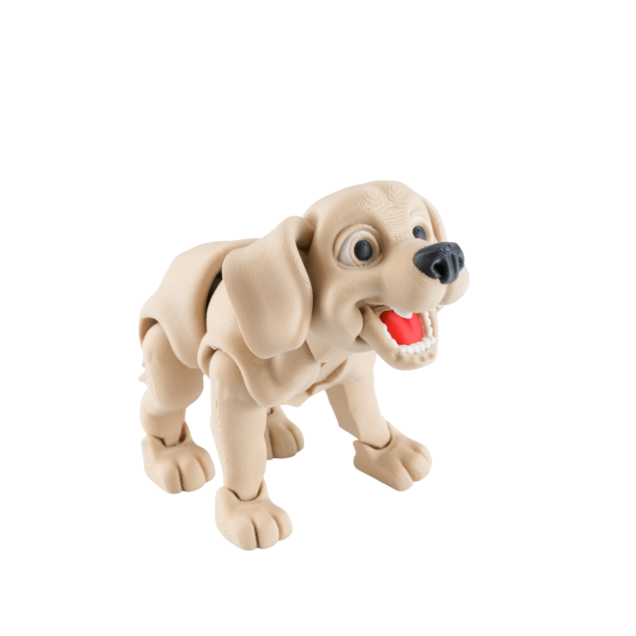 Blablador to figurka labradora z druku 3D, która wygląda, jakby właśnie zaczęła opowiadać Ci o swoim dniu — i nie zamierzała szybko skończyć. Ruchoma mordka otwiera się i zamyka, a ogon merdzi z entuzjazmem godnym prawdziwego labradora przy misce z karmą. Postaw go na biurku, a natychmiast poczujesz, że ktoś słucha — albo mówi, albo jedno i drugie naraz.