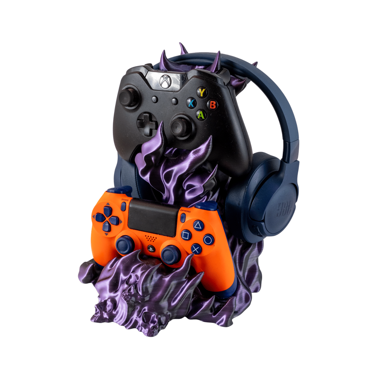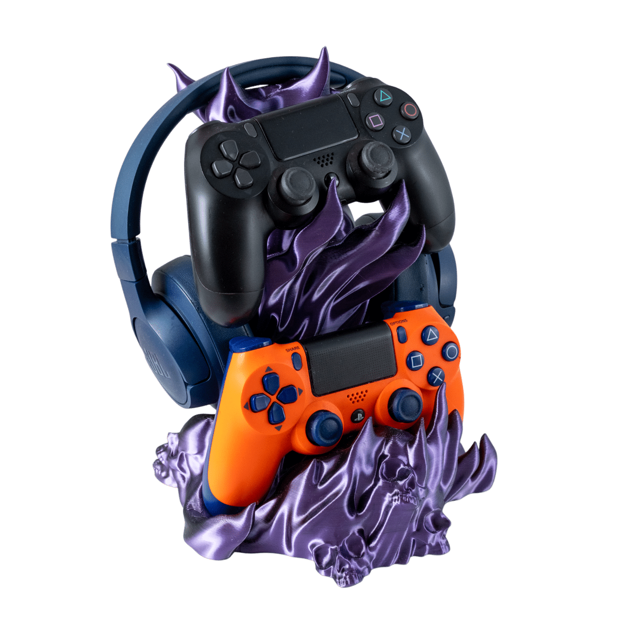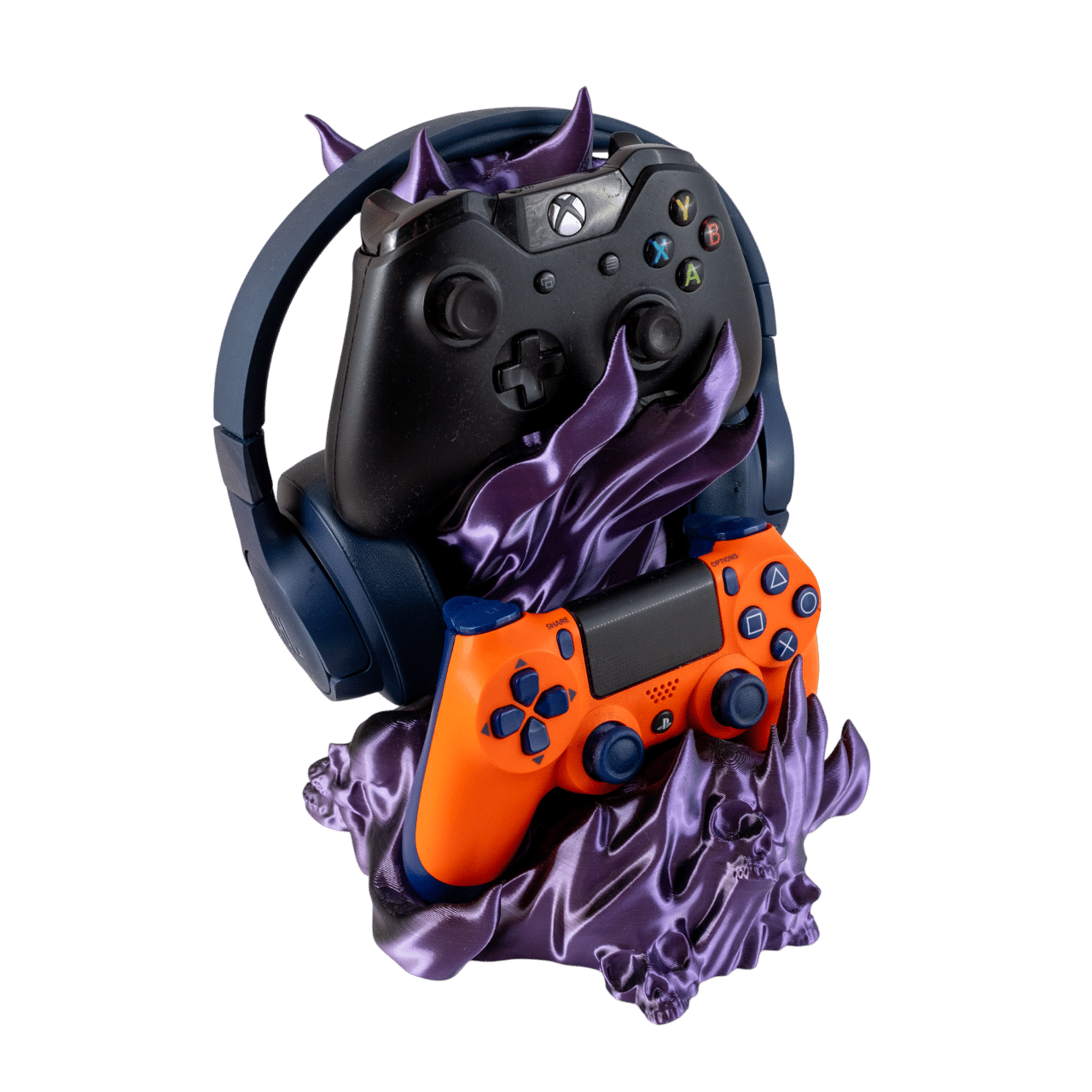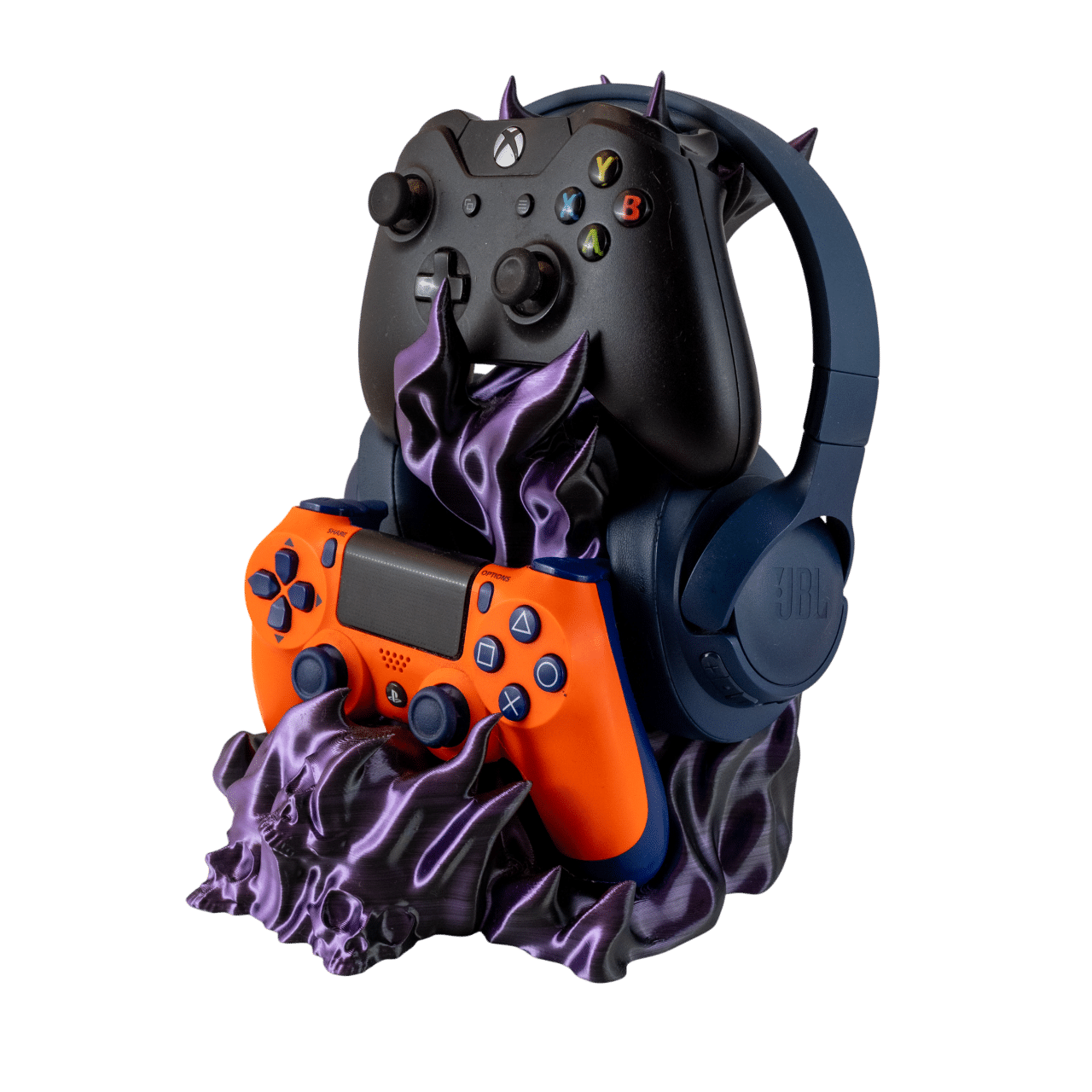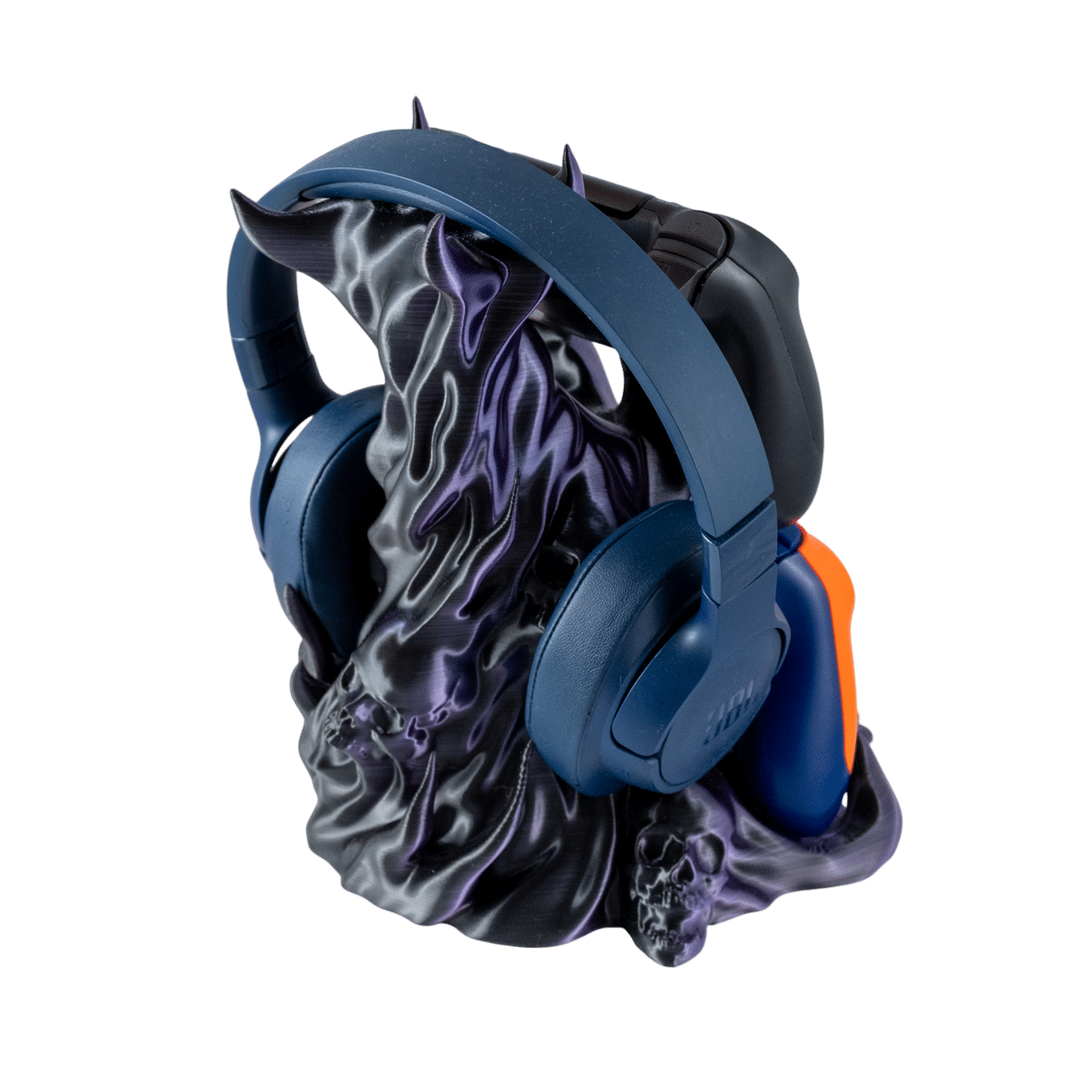 Czachodym Kombo fioletowy stojak na słuchawki i pady z druku 3D z motywem czaszek i dymu, trzymający sprzęt gamingowy.