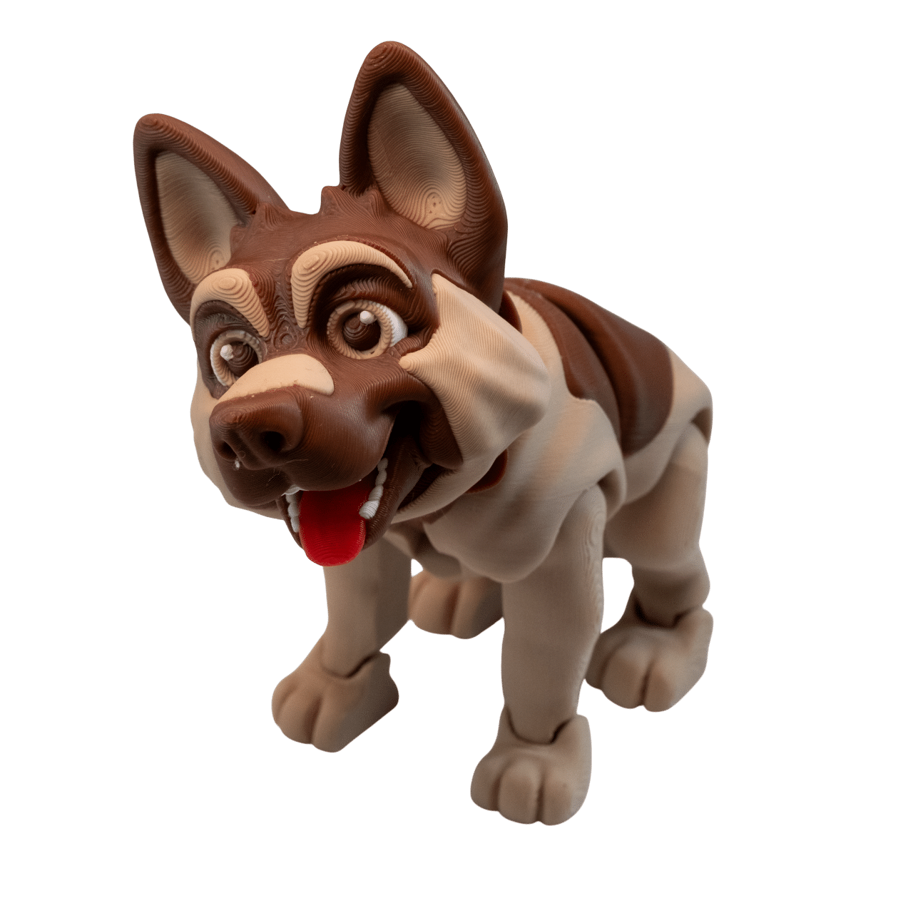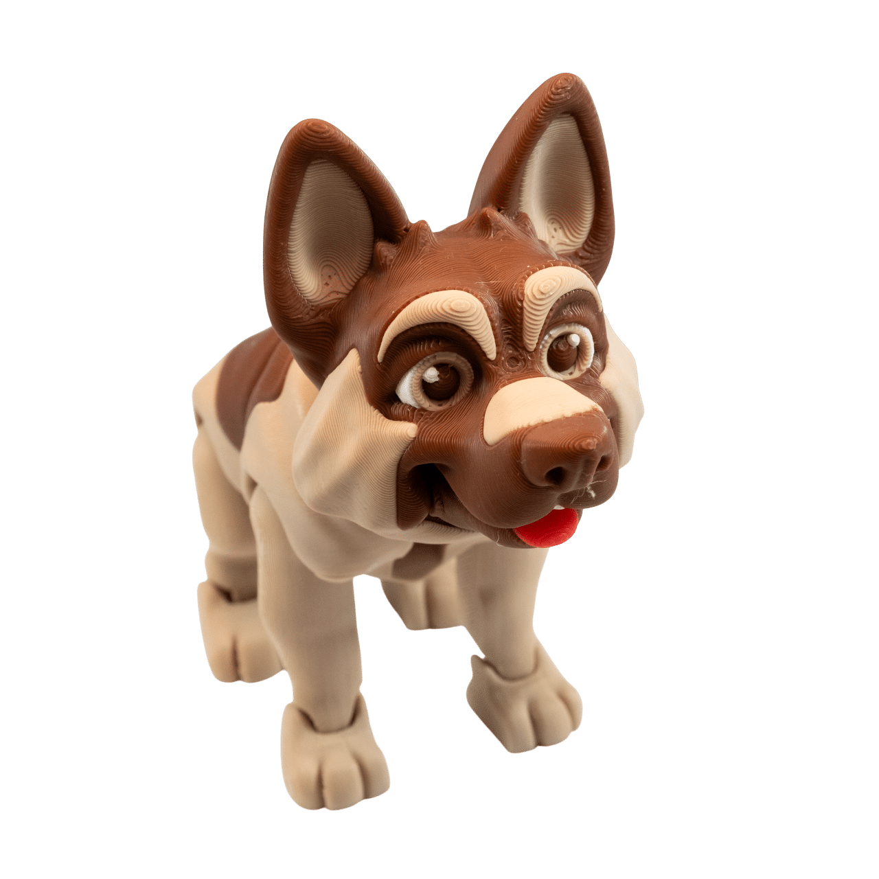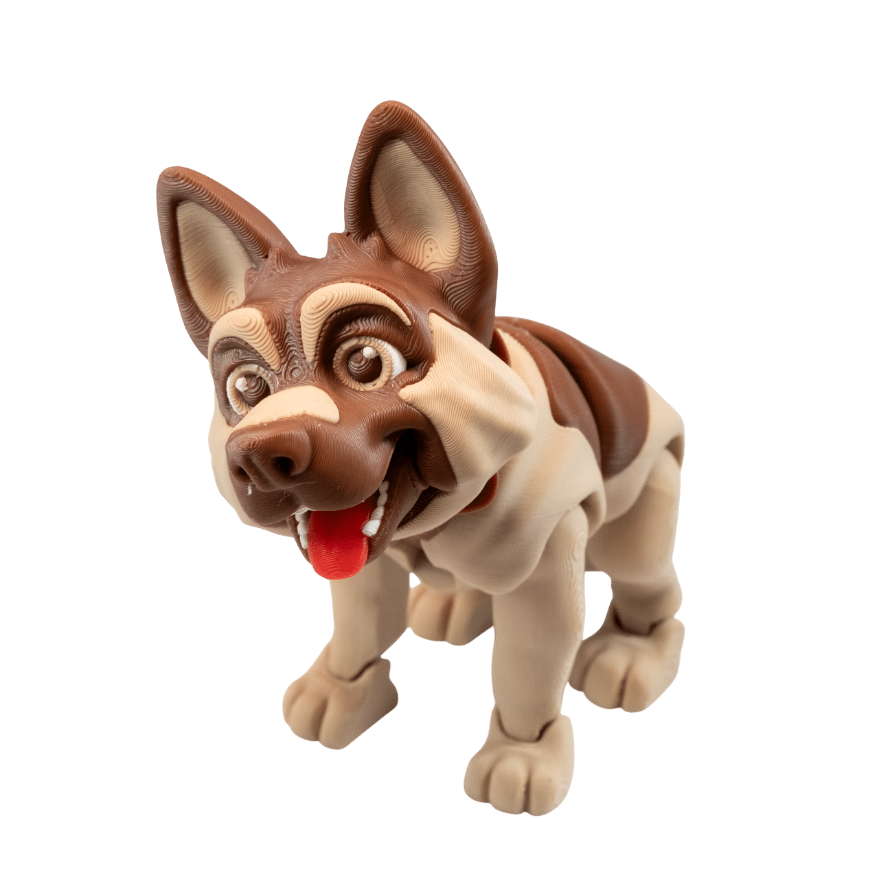 Figurka owczarek niemiecki z druku 3D, Reks w beżowo-brązowych barwach, elastyczny model psa idealny do kolekcji.